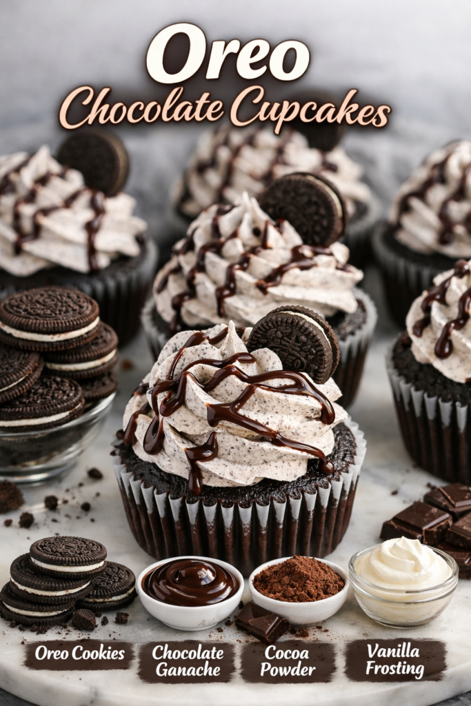 Oreo chocolate cupcakes topped with creamy cookies & cream frosting. Moist, rich, and packed with Oreo flavor in every bite.