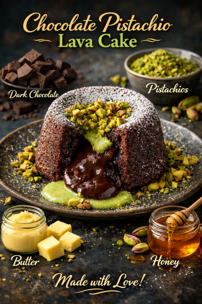 Molten chocolate pistachio lava cake with a rich gooey center and nutty crunch. An elegant, indulgent dessert perfect for special
